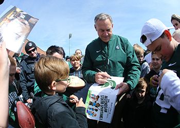 The kids, many of whom sported Spartan gear, broke into smaller groups, taking turns at drill stations manned by smiling Spartan football players. Coaches and players later signed such memorabilia as game programs, footballs and helmets.