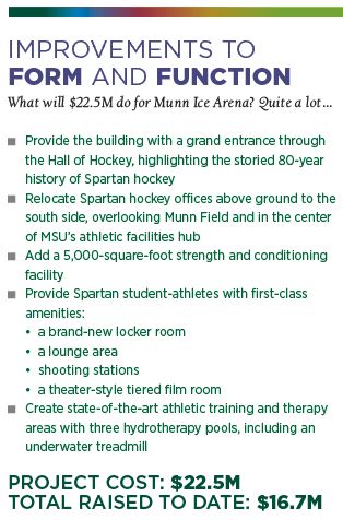 "For me, investing in the Munn renovation project has been a little bit like taking a slap shot off the ankle to save the game. It hurt a bit when I first blocked the shot—when I first made the commitment. But as time goes on, the pain subsides, and what you’re left with is this incredible feeling. It’s indescribable, the amount of pride that I have in what’s happening at Michigan State and in the hockey program.”