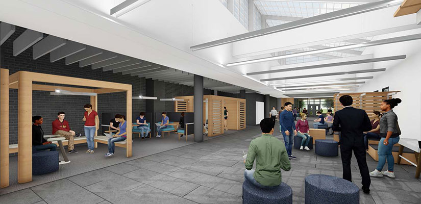 The main corridor, renamed the Ring Container Corridor, will be re-imagined and redesigned with collaboration in mind. The existing outside atrium will be enclosed and adjoined to the current corridor, which will be expanded. This exciting new space will nurture both large and small collaboration groups for students, faculty and industry partners. This prominent space will quickly become a preferred gathering location, not only because of its various collaboration spaces, but because of its comfortable, bright and modern design.