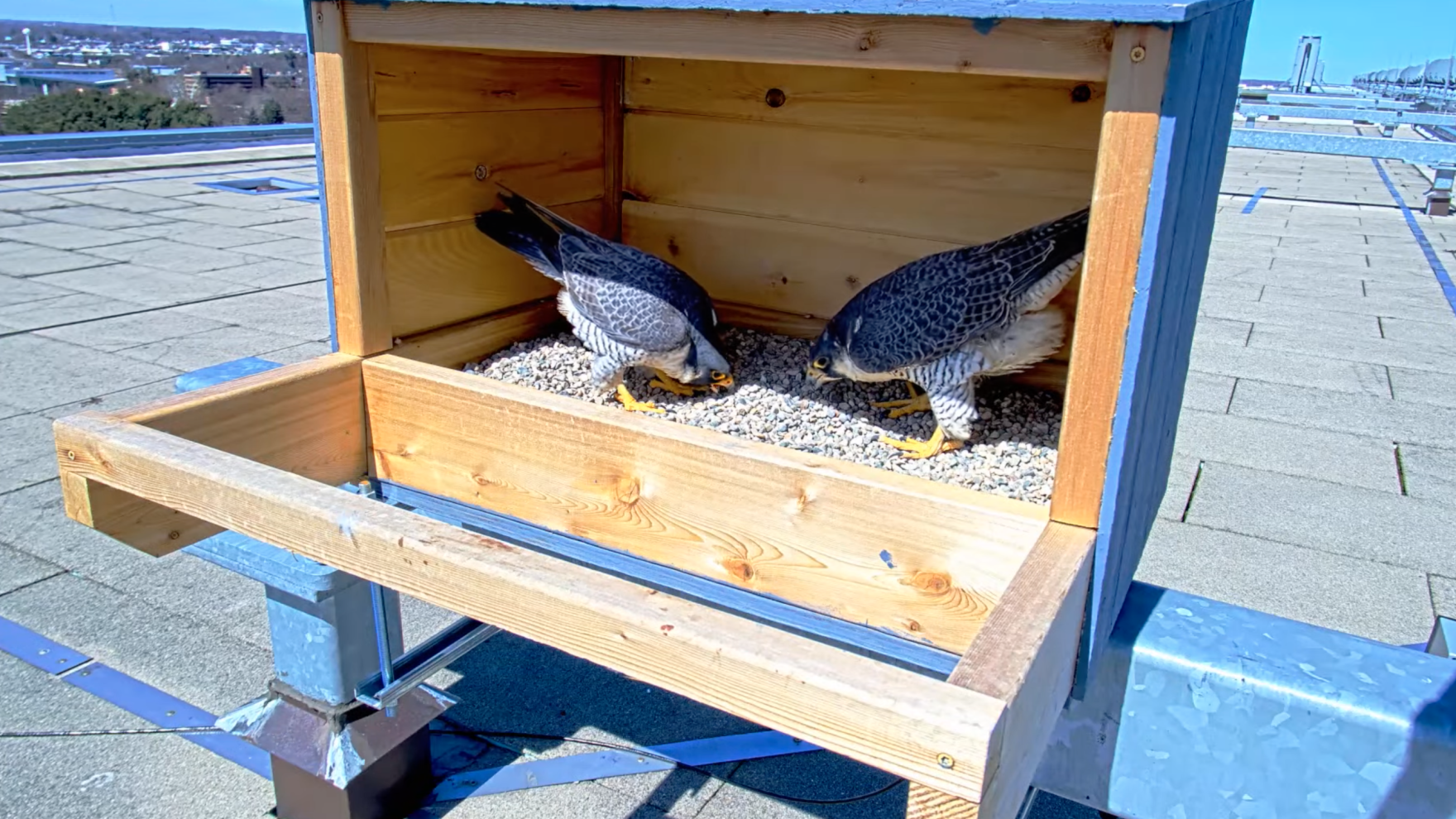 A recently installed nesting box on top of Spartan Stadium has become the penthouse suite for a pair of peregrine falcons.