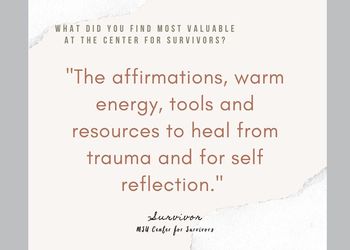 “I cannot even begin to describe it; it’s changed my life,” says Survivor 1. “I could barely get out of bed after my assault, and now my therapist has helped me want to live again and live fully.”